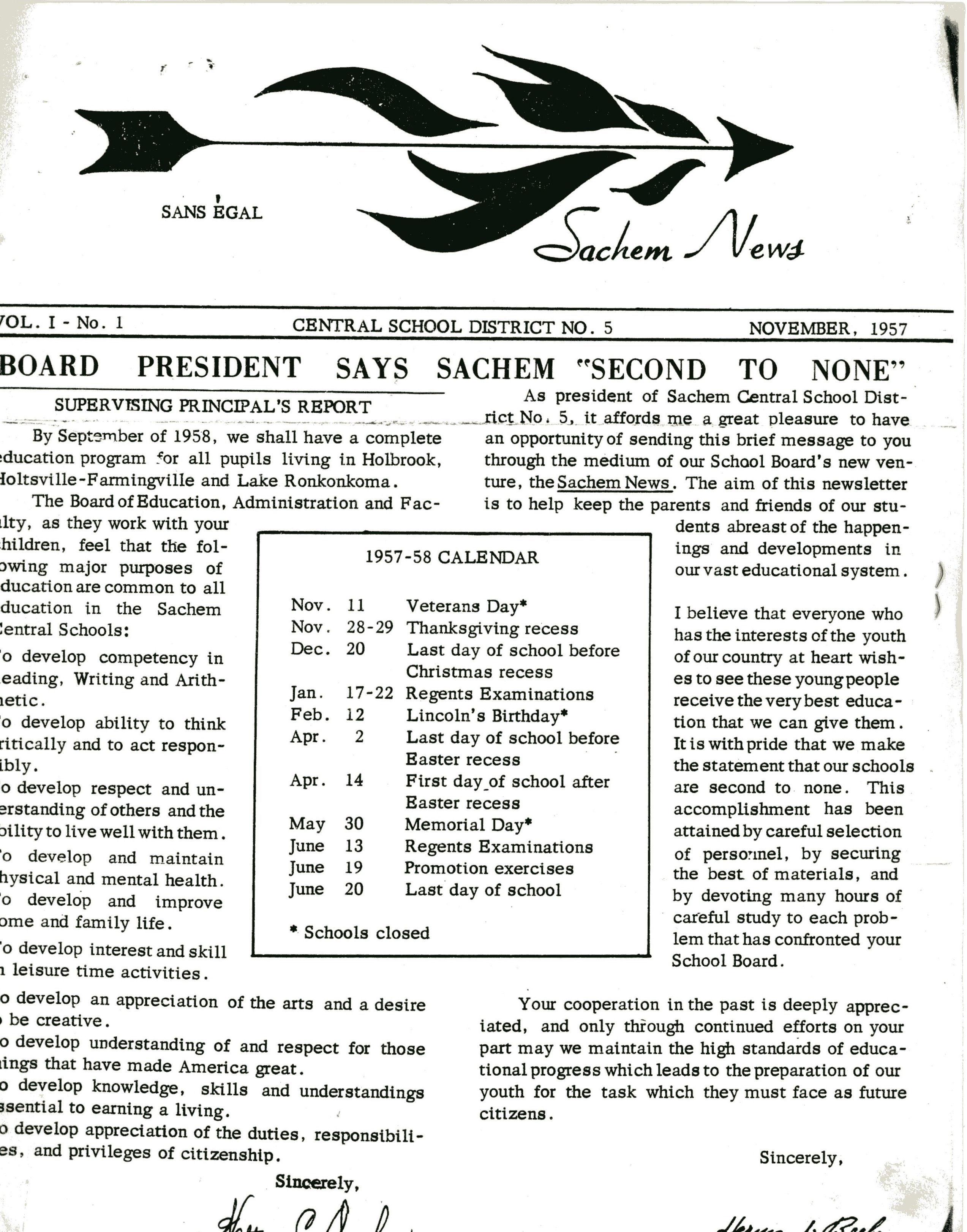 In a letter to the community, Sachem board president Herman Beebe wrote, “I believe that everyone who has the interests of the youth of our country at heart wishes to see these young people receive the very best education that we can give them. It is with pride that we make the statement that our schools are second to none. This accomplishment has been attained by careful selection of personnel by securing the best of materials, and by devoting many hours of careful study to each problem that has confronted our young school board.”