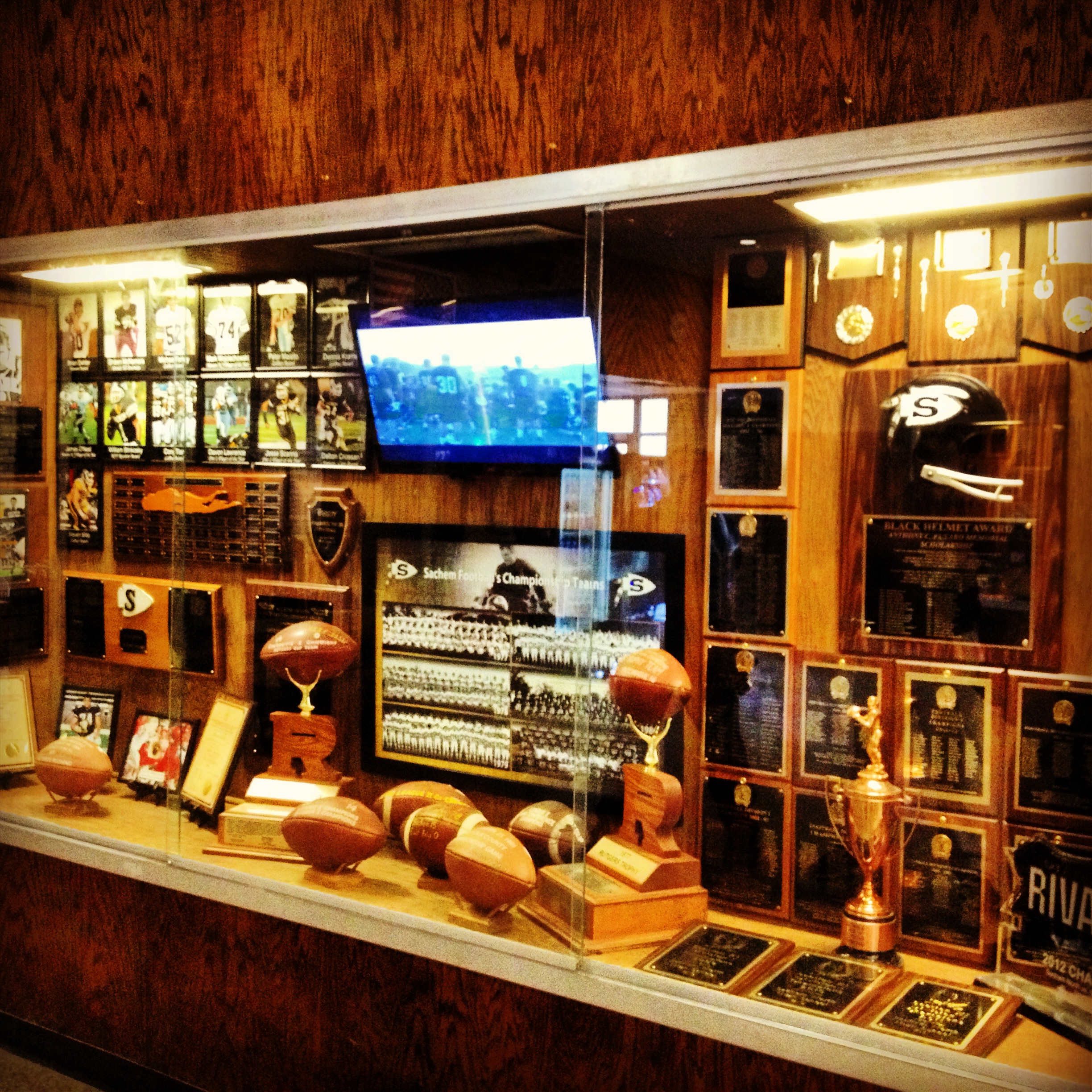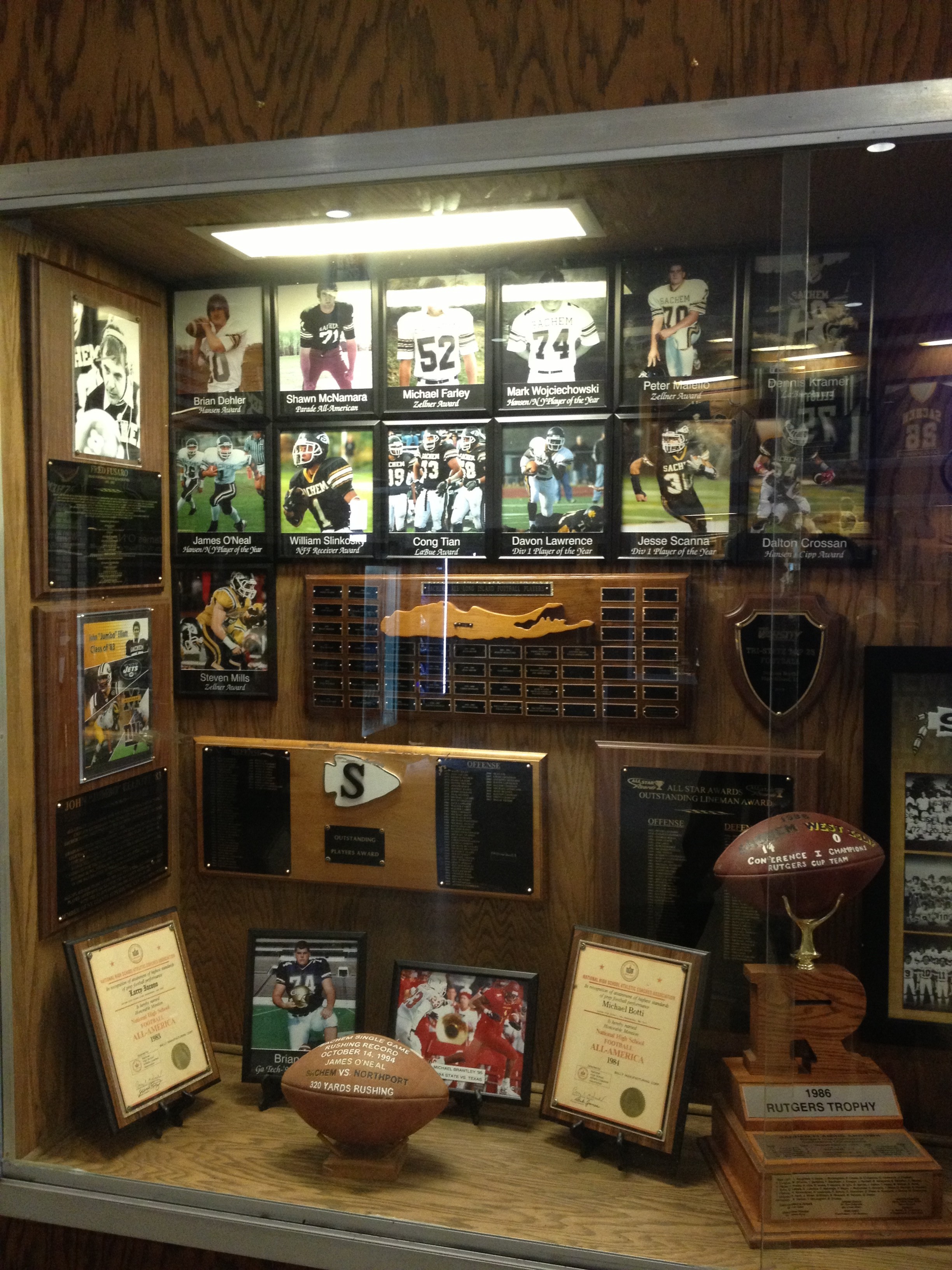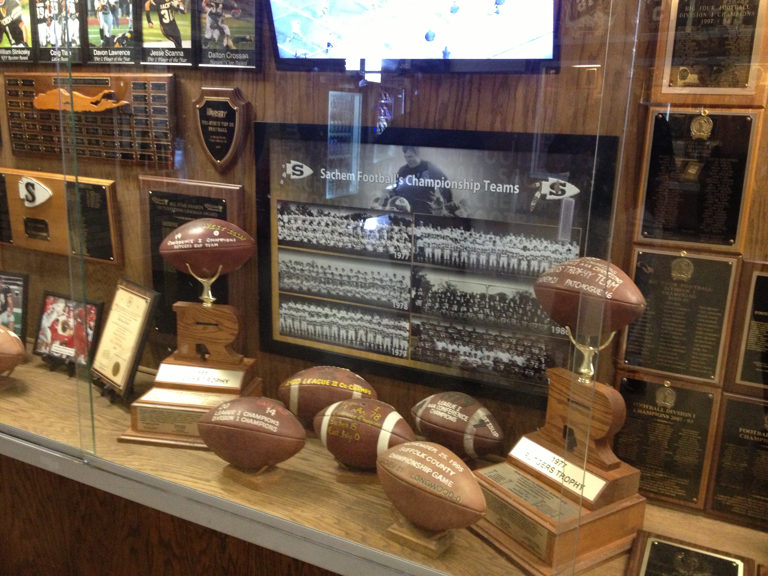 Front and center are Sachem’s two Rutger’s Trophies from 1977 and 1986, and a new championship poster that honors the six teams in program history to win Suffolk County titles (1977, 1978, 1979, 1983, 1986 and 1995). There are also individual 8×10 images of all major award winners, older All-American certificates from some alums, and the most important game balls from championships and record breaking performances.