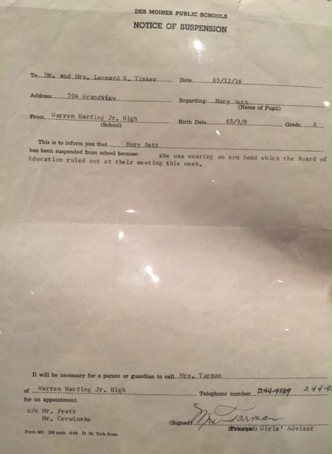When she was asked to remove her arm band by school officials, Tinker complied, but along with others, was later suspended for violating a new school policy against wearing armbands as the school district feared a disruption of classes.