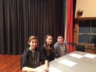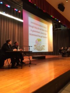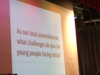 The mellifluous stylings of this acapella group set the tone for the assembly. The stage was set up with a panel of student interviewers seated across from Assemblyman Graf, and the student- prepared questions were projected in the auditorium for all students to view. Students were given the interview questions and were able to take notes during the interview to be a part of follow-up discussions in social studies classes.
