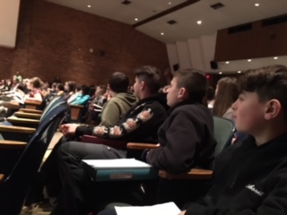 Immediately following the breakfast, a formal assembly was presented to all seventh graders. This component of the visit was organized by the social studies and music departments and run by students in Mr. Kazmark’s class. Students stood as the seventh grade chorus sang a moving rendition of the National Anthem, led by Mrs. Dominick.